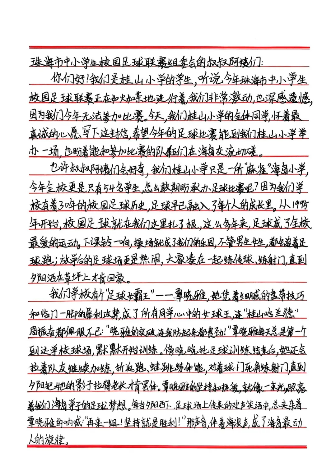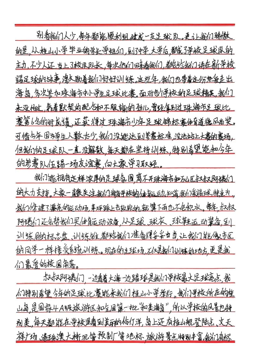 亲爱的同学们,让我们共同期待这场充满友谊、激情与梦想的海岛绿茵之约。愿足球的种子,在这片蓝天碧海之间,生根发芽,开花结果。