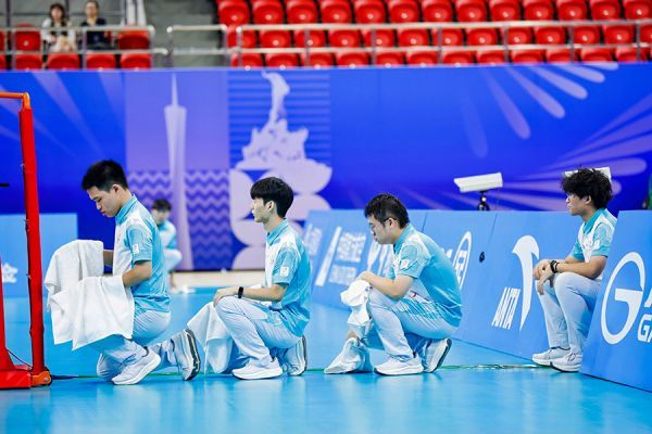 “快擦手”志愿者在排球场边待命(广东技术师范大学供图)顶级配资